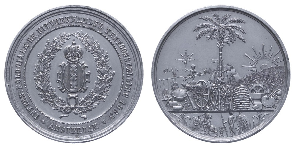 keerzijde: een palmboom omgeven door een veelheid aan attributen betreffende de handel en nijverheid. In de afsnede links een leeuw en rechts een inlander met het heraldisch wapen van Oost-Indië en West-Indië, geflankeerd door lelies.