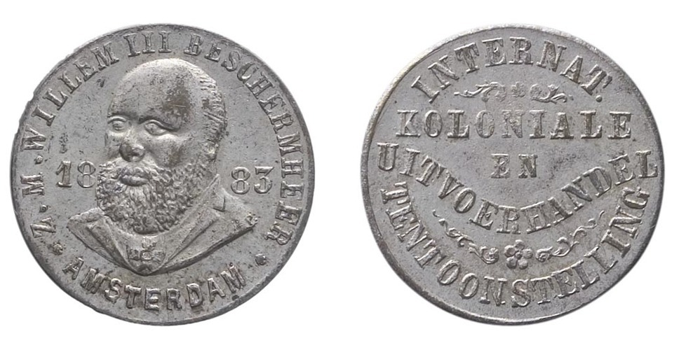 1883, internationale koloniale en uitvoerhandel tentoonstelling te Amsterdam, 1883 koper, metaal hoogte: 1.9 cm; breedte: 1.9 cm; diepte: 0.2 cm; gewicht: 3.64 gr;  omschrift voorzijde: Z.M. WILLEM III BESCHERMHEER * AMSTERDAM *