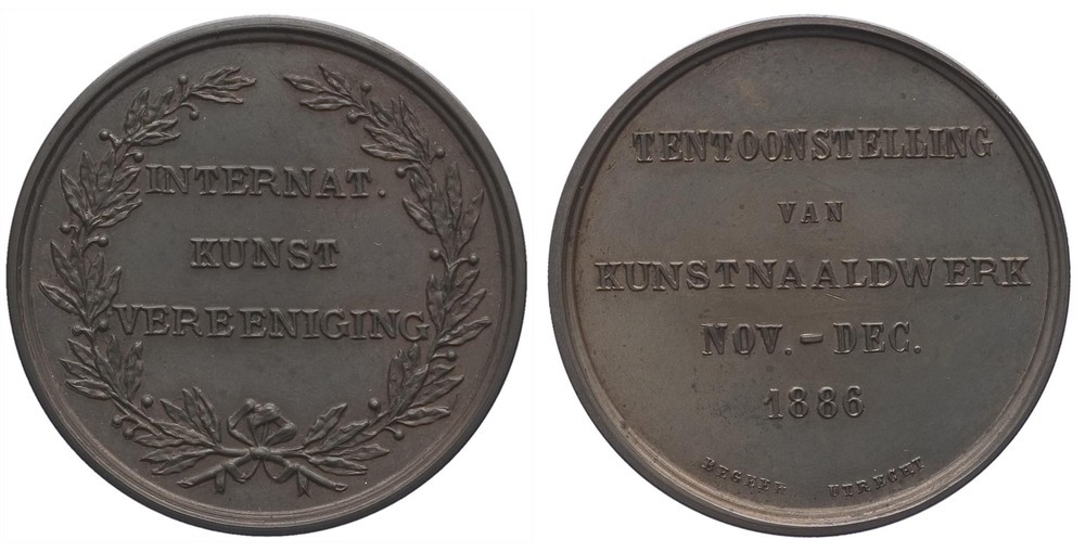 1886, kunstnaaldwerk, tentoonstelling v. -, internationale kunstvereniging, 1886 brons hoogte: 4 cm; breedte: 4 cm; diepte: 0.4 cm; gewicht: 34.88 gr; opschrift voorzijde: INTERNAT. / KUNST / VEREENIGING