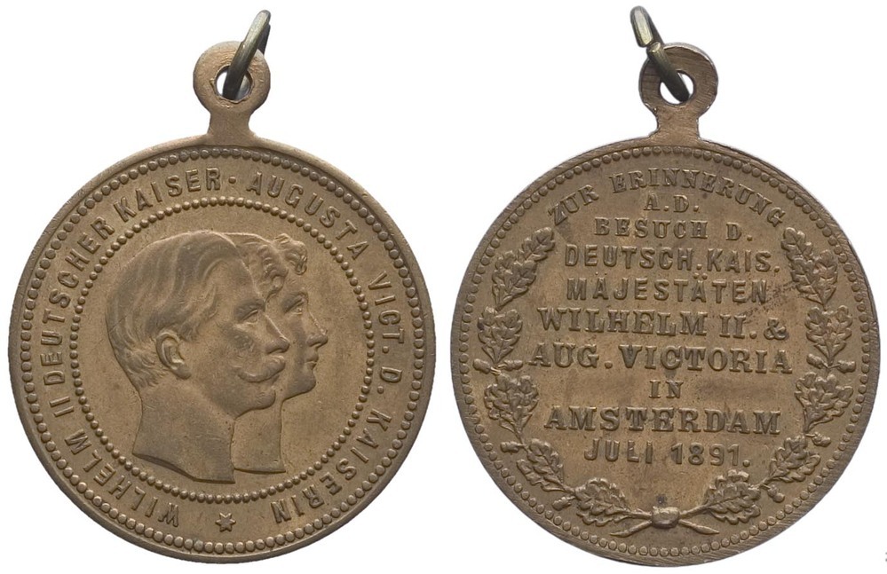 opschrift keerzijde: ZUR ERINNERUNG / A.D. / BESUCH D. / DEUTSCH. KAIS. / MAJESTÄTEN / WILHELM II. & / AUG. VICTORIA / IN / AMSTERDAM / JULI 1891.