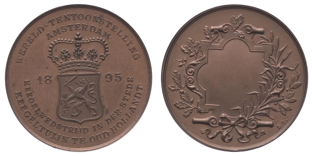 omschrift voorzijde: WERELD-TENTOONSTELLING KEEGELTUIJN TE OUD-HOLLAND / KEEGELWEDSTRIJD IN DER STEEDE AMSTERDAM / 1895