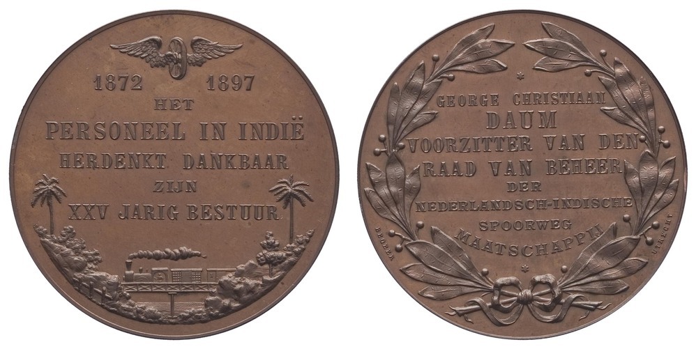opschrift keerzijde: GEORGE CHRISTIAAN / DAUM / VOORZITTER VAN DEN / RAAD VAN BEHEER / DER / NEDERLANDSCH-INDISCHE / SPOORWEG / MAATSCHAPPIJ *