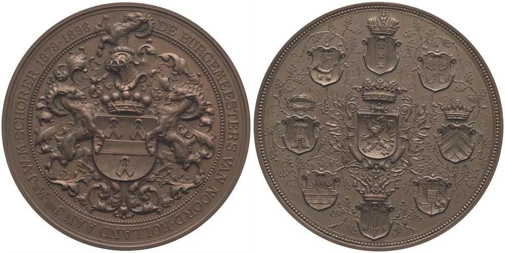 omschrift voorzijde: DE BURGEMEESTERS VAN NOORD-HOLLAND AAN JHR . MR . J . W . M . SCHORER 1879 - 1896