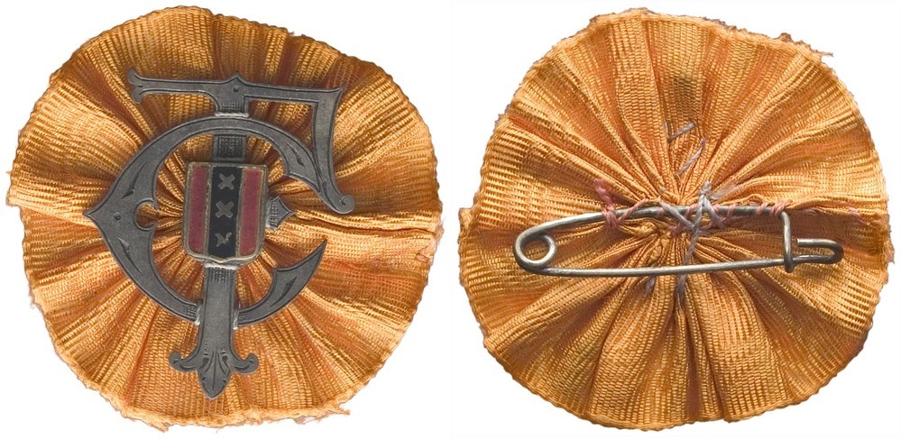 voorzijde: een ajour bewerkte penning op een oranje kleurig riblint. Het geemailleerde wapen van Amsterdam in rood en zwart, bevestigd op de uitgesneden letters F en C. keerzijde: een speld.- Trefwoorden