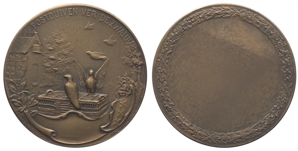 voorzijde: een omschrift met links een duivenhok met boom, bovenin spoeden een drietal duiven zich naar het hok, in het midden zitten twee duiven op een duivenmand, rechts het wapenschild van Amsterdam en een boom, links een lauwertak. Onder een lege cartouche, linksonder een signatuur.