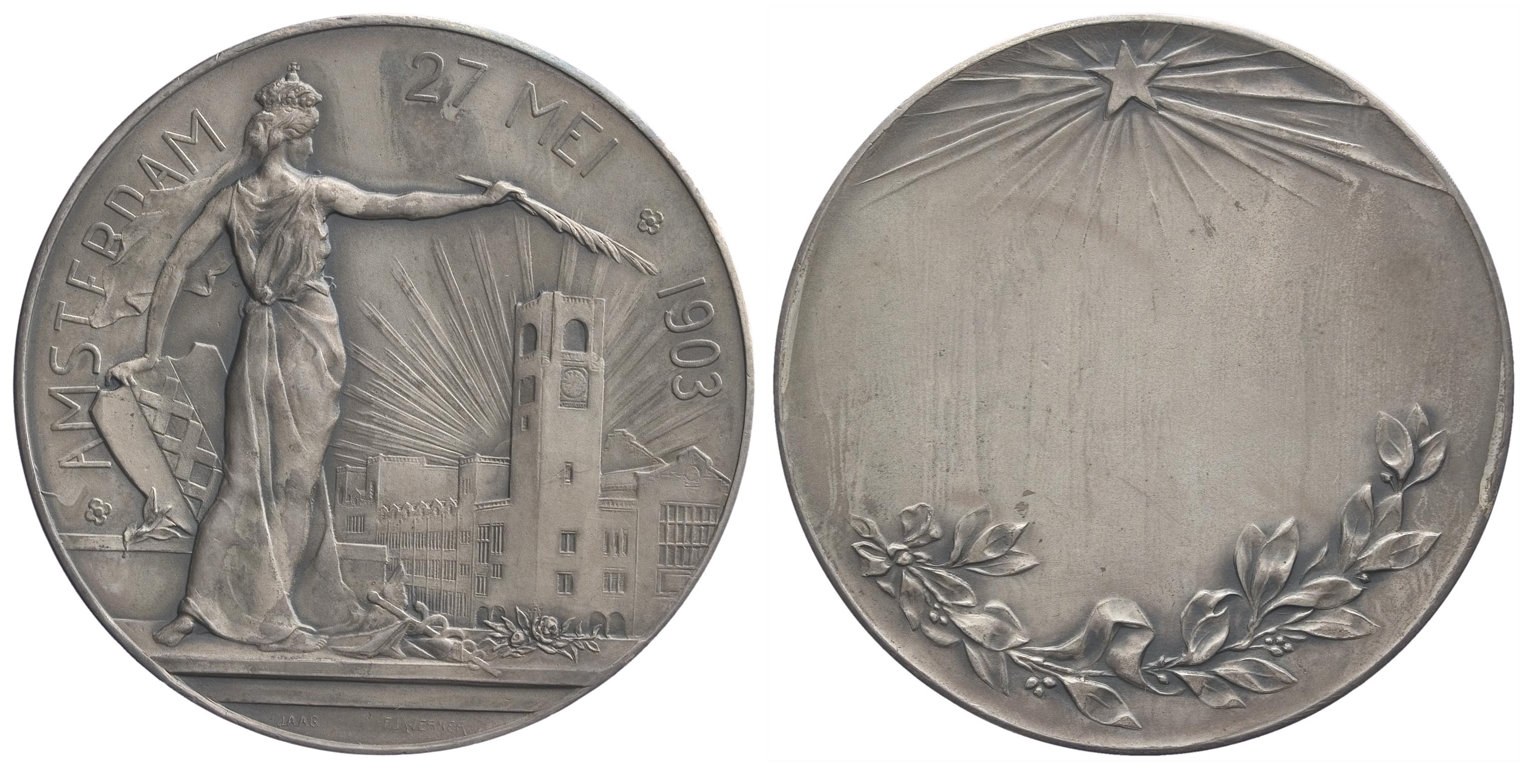 De Beurs van Berlage was in Amsterdam het derde beursgebouw op rij. Het eerste werd in 1611 gebouwd door Hendrick de Keyser en stond aan de Vijgendam, op de hoek van Dam en Rokin. In 1845 verrees een nieuw beursgebouw naar een ontwerp van J.D. Zocher dat aan de noordzijde van de Dam kwam te staan, waar zich nu de Bijenkorf bevindt. Na de opening van het Noordzeekanaal in 1876 beleefde Amsterdam een enorme economische opleving en ontstond een behoefte aan een groot, modern gebouw waar alle beursactiviteiten ondergebracht konden worden. De stad Amsterdam gaf de architect H.P. Berlage opdracht om een nieuw Koopmansbeurs te bouwen en op 27 mei 1903 werd het nieuwe Beursgebouw door koningin Wilhelmina officieel geopend. De medailleur F.J. Werner werd gevraagd voor de penning ter gelegenheid van de opening. Ook voor de openingen van de eerdere beursgebouwen waren er penningen uitgebracht. Op de penning van Werner leunt de Amsterdamse stedemaagd, op de rug gezien, met haar linkerhand op het wapenschild van Amsterdam. Zij houdt met haar rechterhand een palmtak boven het door zonnestralen omkranste nieuwe gebouw. ( Judith van Gent)
