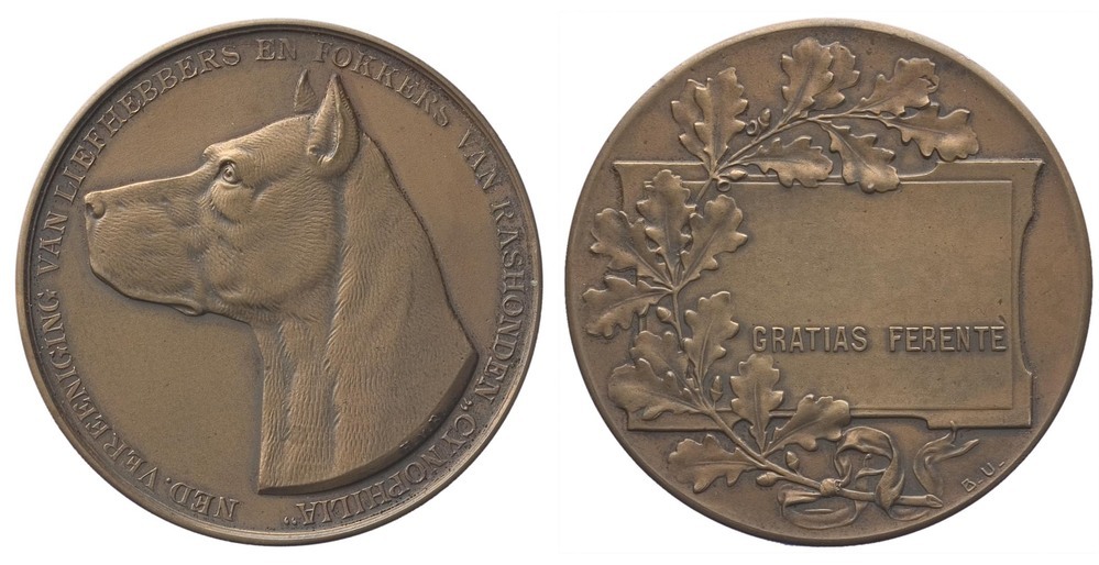 omschrift voorzijde: NED. VEREENIGING VAN LIEFHEBBERS EN FOKKERS VAN RASHONDEN "CYNOPHILIA"