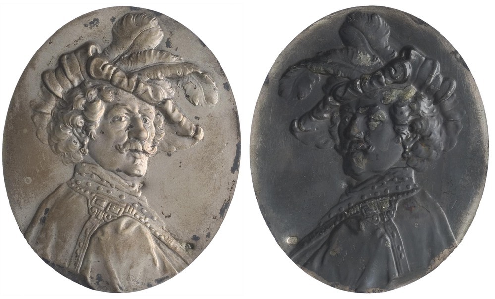 voorzijde: ovale penning: borstbeeld van Rembrand schuin naar rechts met baret met veren. Zilverkeur. keerzijde: spiegelbeeld van de voorzijde.- Trefwoorden