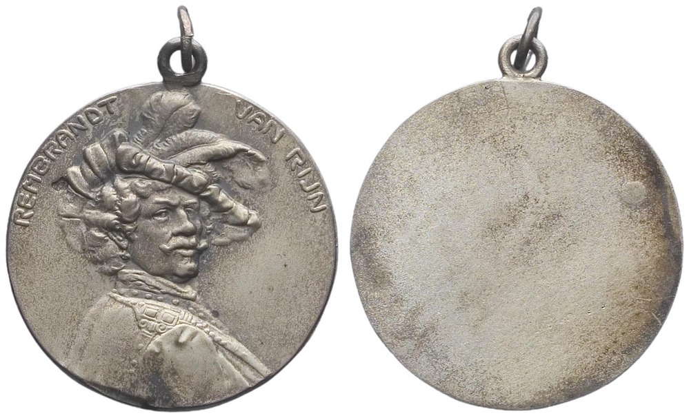 voorzijde: in een omschrift het borstbeeld van Rembrandt schuin naar rechts, met een uitbundige baret met veren. Bovenaan een oog met ring. keerzijde: onbewerkt.- Trefwoorden