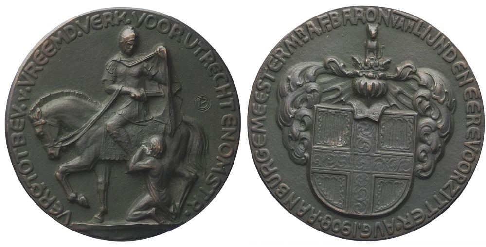 voorzijde: in een omschrift de allegorie van St. Maarten en de bedelaar: een ridder te paard, rijdend naar links, die zijn mantel met zijn zwaard in tweeën snijdt en de helft aan de knielende bedelaar geeft. Rechts een monogram.