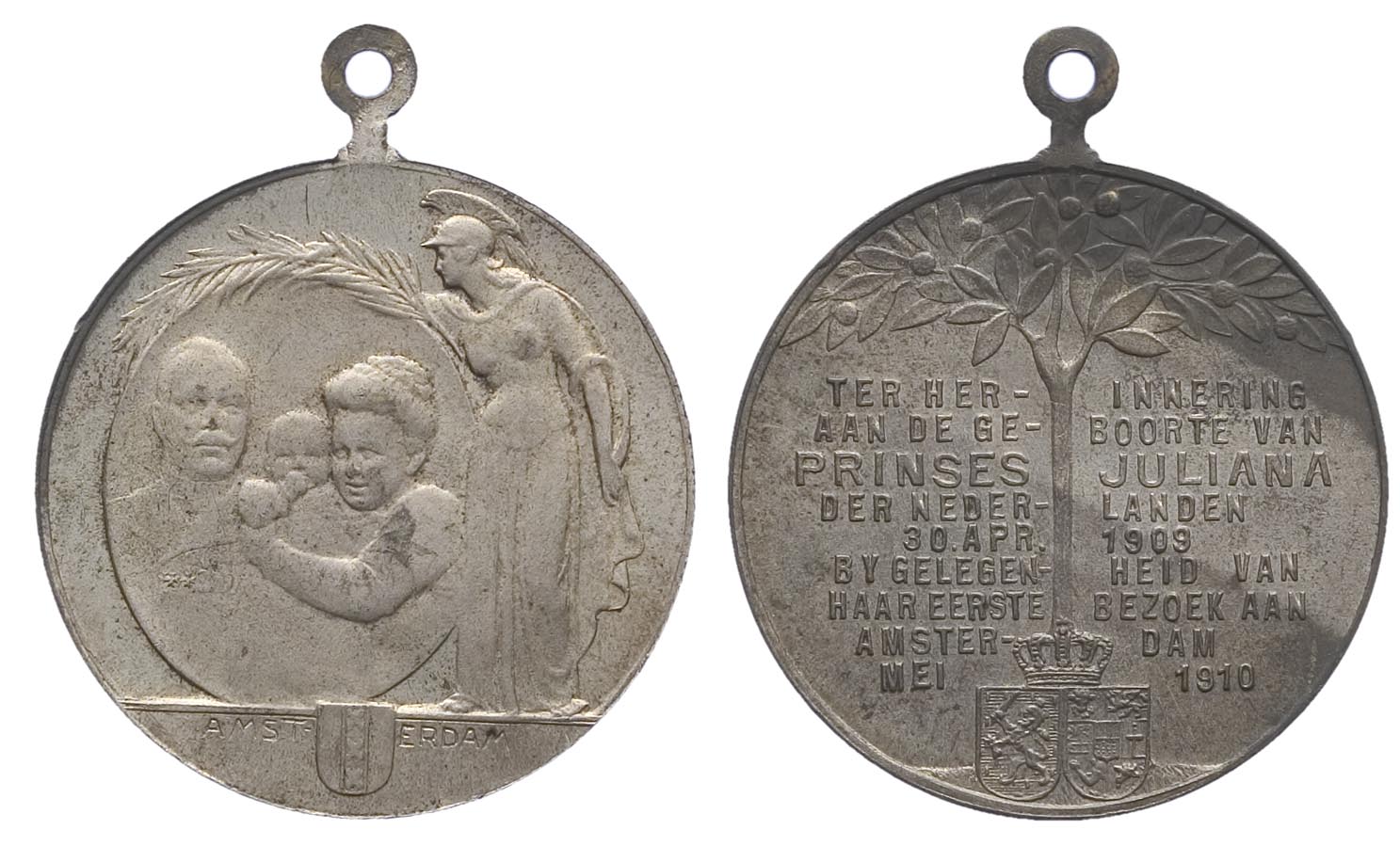opschrift keerzijde: TERHER- INNERING / AAN DE GE- BOORTE VAN / PRINSES JULIANA / DER NEDER- LANDEN / 30.APR. 1909 / BY GELEGEN- HEID VAN / HAAR EERSTE BEZOEK AAN / AMSTER- DAM / MEI 1910