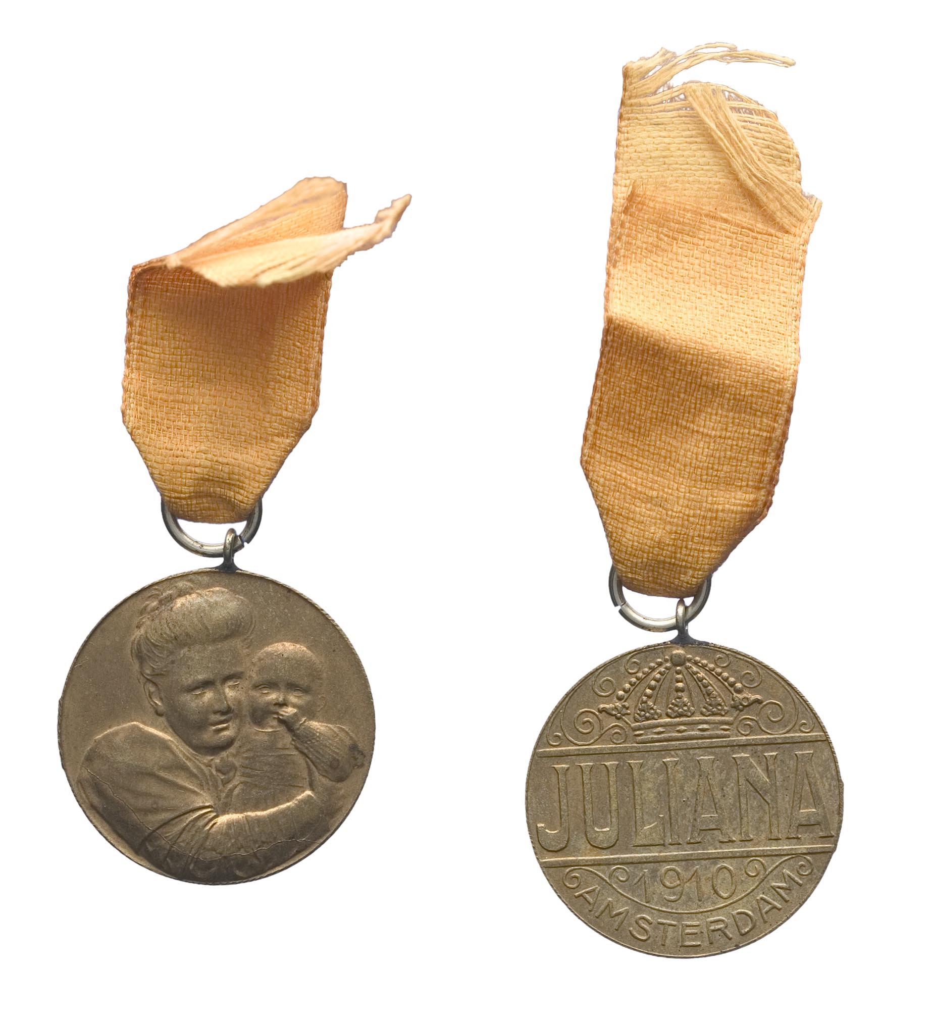 voorzijde: koningin Wilhelmina met prinses Juliana op de arm. Bovenaan een oog met ring waaraan een goudkleurig riblint. keerzijde: under een kroon het opschrift JULIANA. Daar onder een opschrift.