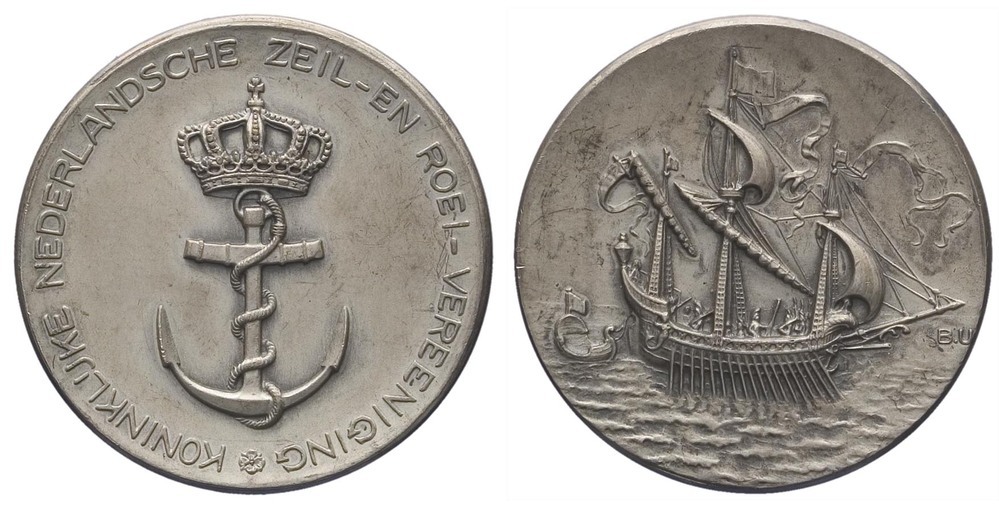 keerzijde: een galei naar rechts op het water met roeiers, roeispanen en twee gehesen fokzeilen, drie masten met vlag en wimpels. Links achter de galei een roeibootje. Rechts een signatuur.