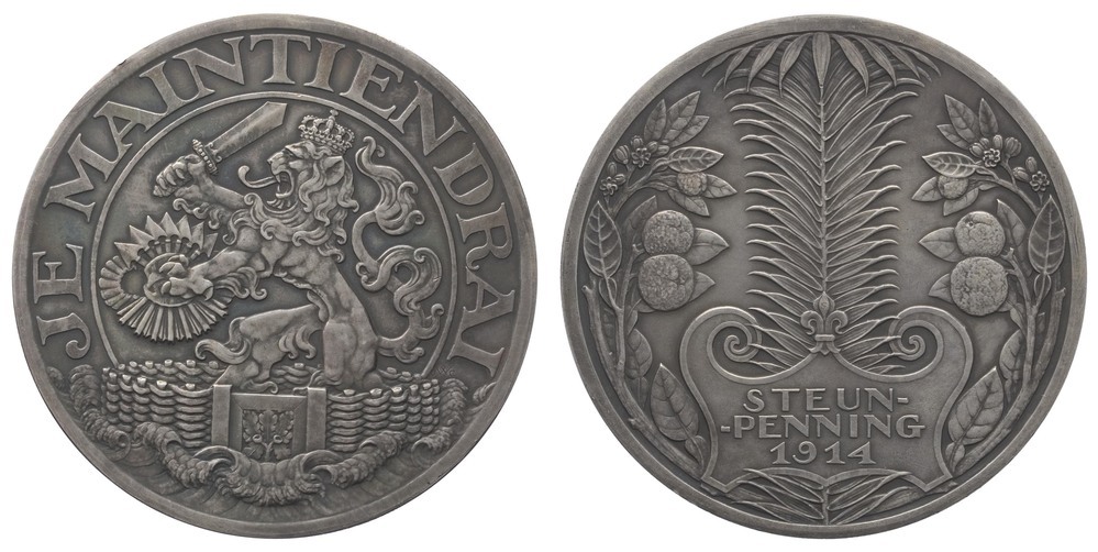 Door het uitbreken van de oorlog in 1914 dreigde een verarming van grote aantallen werkeloos geworden arbeiders. Om dit te voorkomen richtte minister Treub het Koninklijk Nederlands Steuncomité (KNS) op met als doel was het verschaffen van steun aan werklozen. Het comité liet steunpenningen slaan waarmee men met de aankoop kon bijdragen. Deze steunpenning uit 1914 is ontworpen door J.C. Wienecke (1872-1945). ( Judith van Gent)