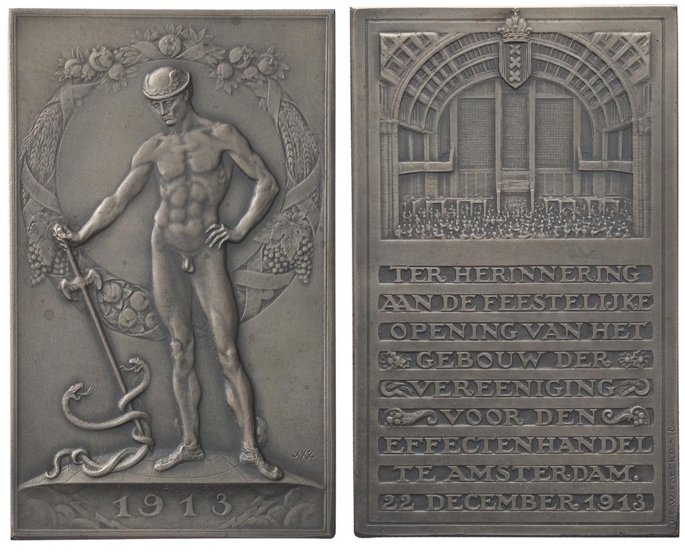 opschrift keerzijde in de afsnede: TER HERINNERING / AAN DE FEESTELIJKE / OPENING VAN HET / GEBOUW DER / VEREENIGING / VOOR DEN / EFFECTENHANDEL / TE AMSTERDAM. / 22 DECEMBER 1913