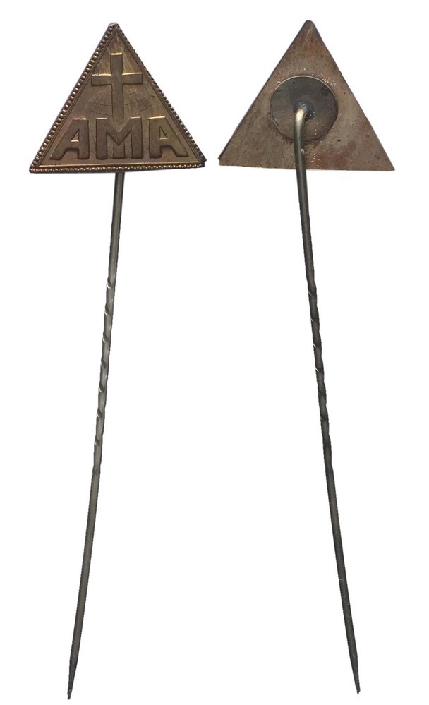voorzijde: driehoekige speld met parelrand waarbinnen een christelijk kruis en een opschrift. keerzijde: onbewerkt.- Trefwoorden