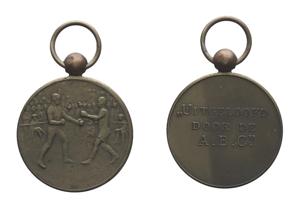 voorzijde: twee boksers in gevecht met publiek op de achtergrond. Bovenaan een oog met ring. keerzijde: een opschrift.- Trefwoorden