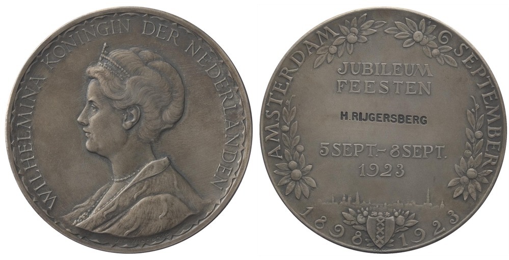 keerzijde: in een omschrift, afgewisseld door grote oranjetakken met bloemen, het silhouet van de stad Amsterdam. Onderaan het wapenschild van Amsterdam. Op het centrale deel een opschrift.