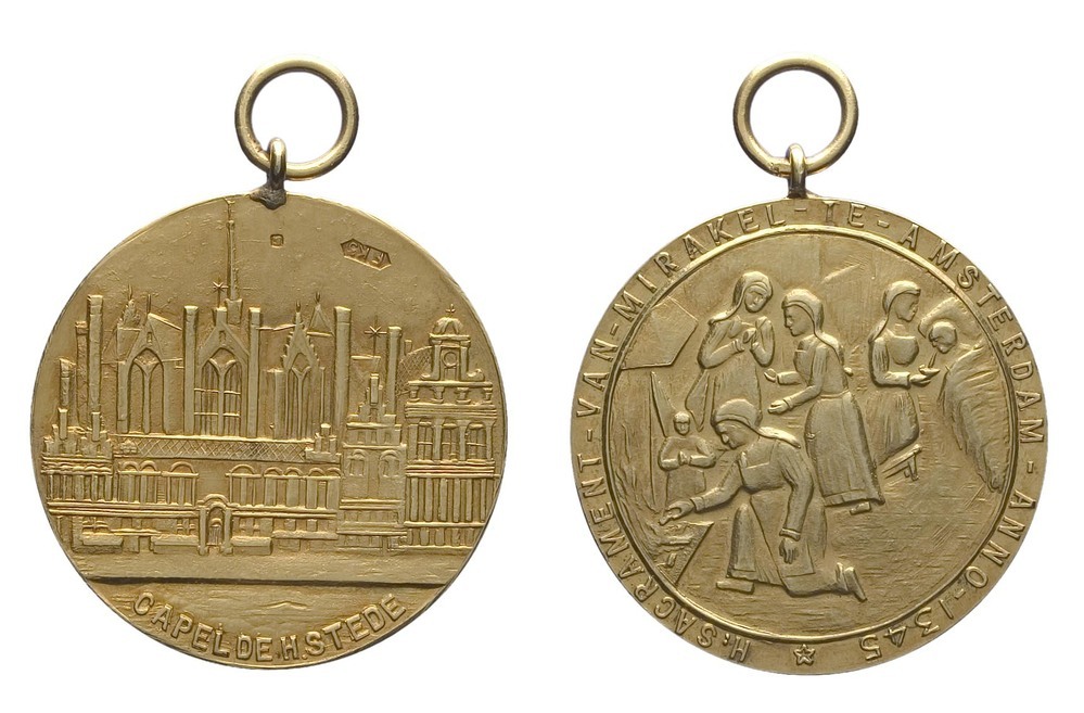 Ter gedachtenis van het Mirakel van Amsterdam dat zeshonderd jaar eerder had plaatsgevonden, werd in 1946 een penning geslagen. Op de voorzijde zijn scènes uit het Mirakel afgebeeld, op de keerzijde een afbeelding van de Heilige Stede. ( Judith van Gent)