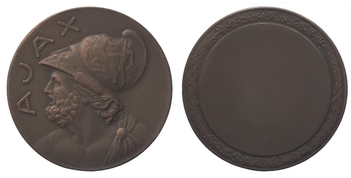 voorzijde: de Griekse held Ajax en profile naar links met helm. Links boven de naam AJAX. keerzijde: een gebonden eikenloof- lauwerkrans rond een leeg veld.- Trefwoorden