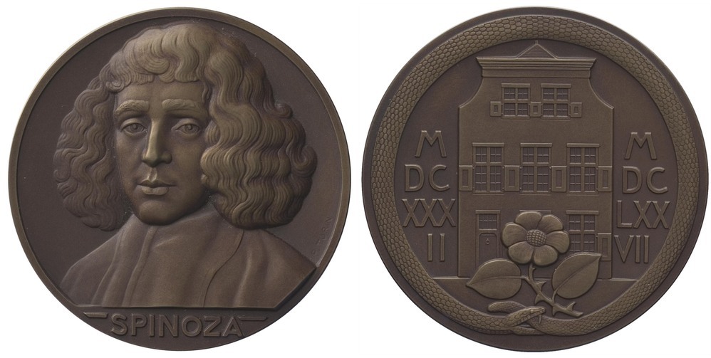 vooezijde: borstbeeld van Spinoza en face. Rechts daarvan een signatuur langs de rand. In de afsnede het opschrift SPINOZA.