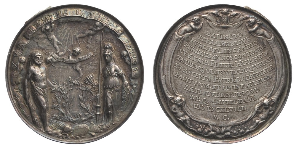 opschrift keerzijde: EXTINCTO / TERRA MARIQVE / PVBL.BEL.INCENDIO / PER LXXX ANNOS CONTINVA. / CUM TRIB. PHILIP. HISP. REG. / TANDEMQ. ODIIS VTRIMQ. SVBLAT. / ET ASSERTA PATRIAE LIBERTATE / PACIS NOM. ET OMINE AETERN. / LAETI LVBENTES QUE / S.P.Q. AMSTELDAM. / M D CXLVIII. / S. C.
