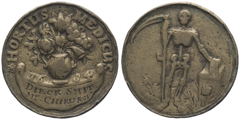 voorzijde: de dood als geraamte en face, in de rechterhand een zeis, de linkerhand rustend op een zandloper, geplaatst op een altaar.