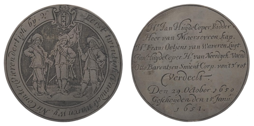 opschrift keerzijde: Hr. Jan Huijdecoper, ridder / Heer van Maerseveen. kap. / Hr. Frans Oetjens van Waveren Luyt. / Jan Huydecoper. Hr. van Neerdyck. Vaend. / Otto Barentsen Smient Corp. van 't 3e rot / verdeelt. / Den 29 October 1650 / Gescheijden den 25 Janu. / 1651.