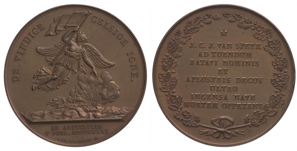opschrift keerzijde: J.C.J. VAN SPEYK / AD TUENDUM / BATAVI NOMINIS / ET / APLUSTRIS DECUS / ULTRO / INCENSA NAVE / MORTEM OPPETENS