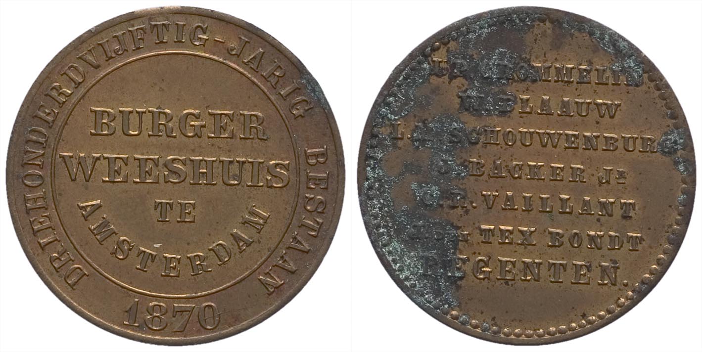 Trefwoorden penning, gelegenheidspenning, wezenzorg, jubileum, regenten, Burgerweeshuis, Jacob Pieter Crommelin, Willem Blaauw, Jacob (II) Backer, C.R. Vaillant, J. den Tex Bondtpenningen- en muntencollectie Amsterdam Museum, bruikleen van Stichting Het Burgerweeshuis - Rooms Catholiek Jongens Weeshuis