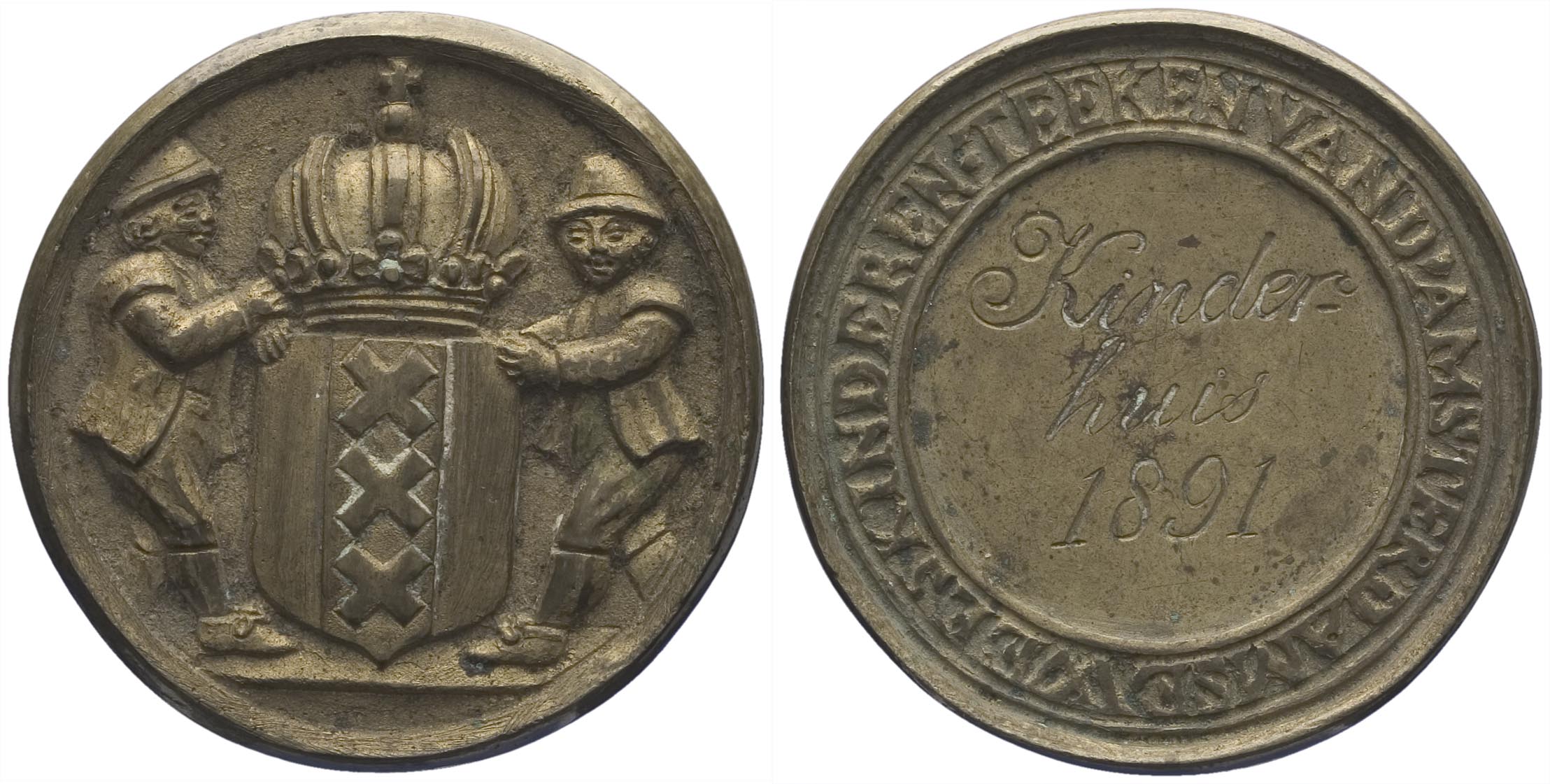 Penning van het Kinderhuis van het Burgerweeshuis, 1891 koper hoogte: 4.4 cm; breedte: 4.4 cm; diepte: 0.4 cm; gewicht: 33.10 gr; omschrift keerzijde: TEEKEN VAN D'AMSTERDAMSE WEESKINDEREN