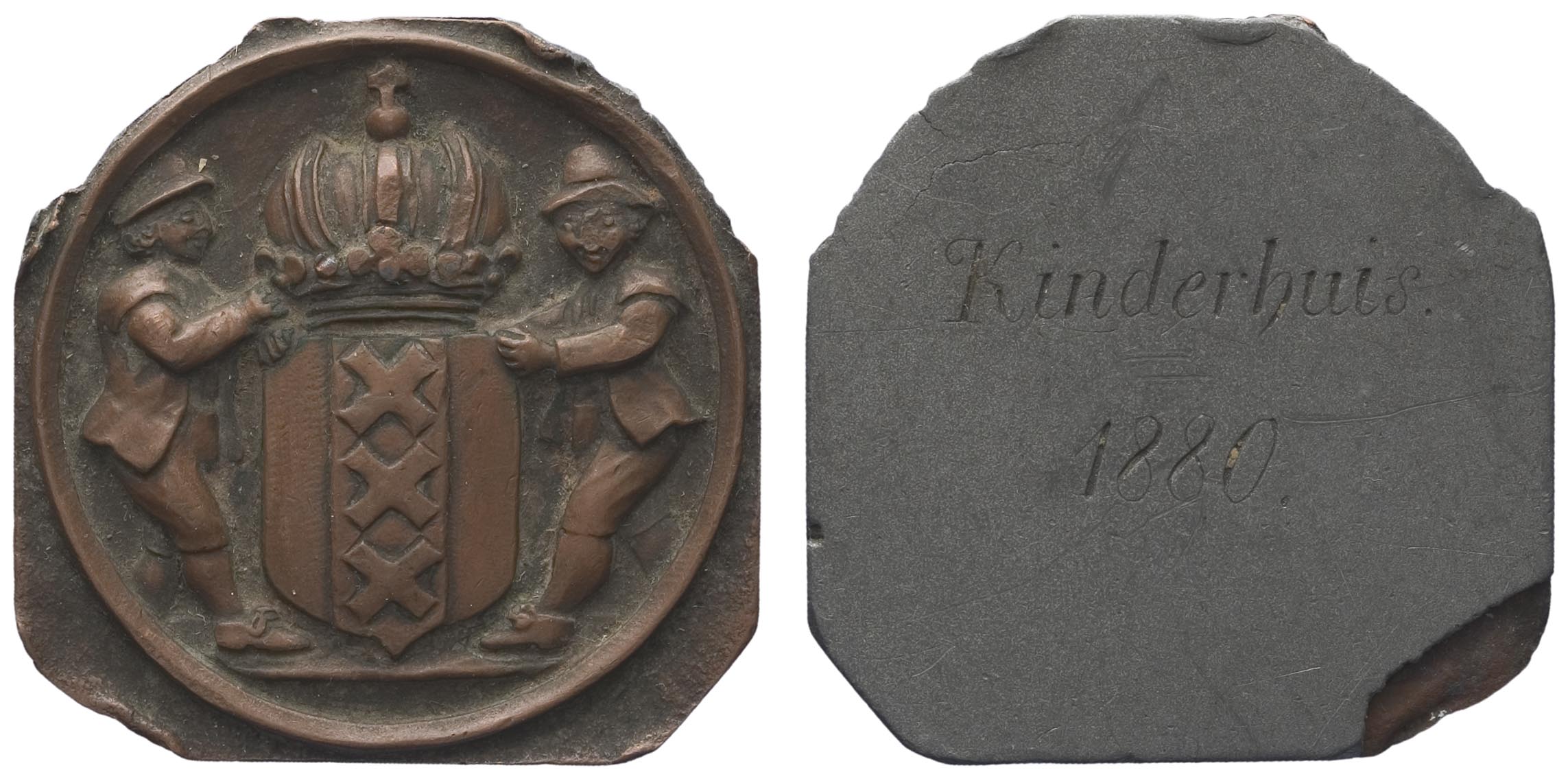 voorzijde: het gekroonde wapen van Amsterdam geflankeerd door twee weesjongens. keerzijde: een gegraveerd opschrift.- Trefwoorden