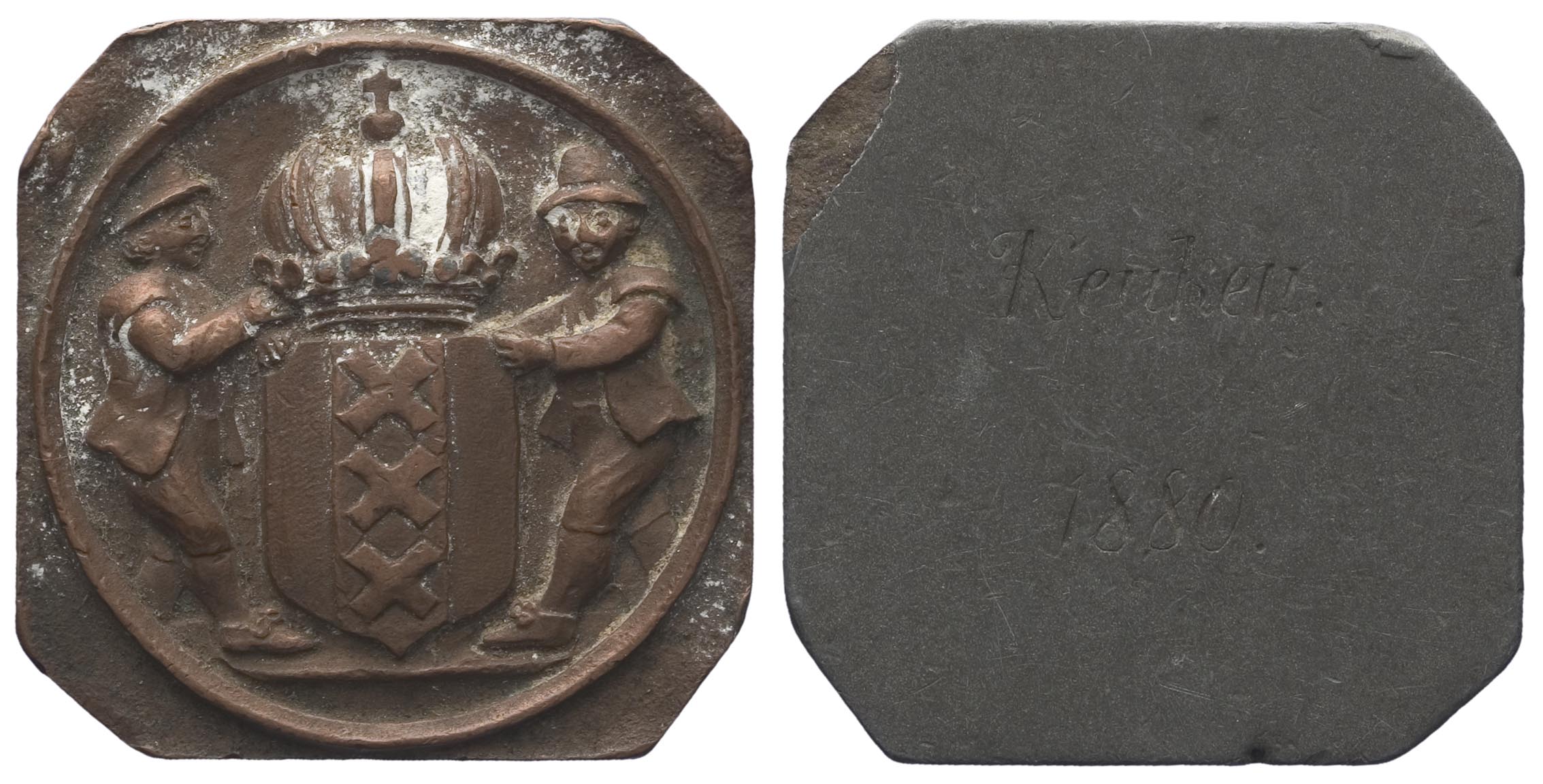 voorzijde: het gekroonde wapen van Amsterdam geflankeerd door twee weesjongens. keerzijde: een gegraveerd opschrift.- Trefwoorden