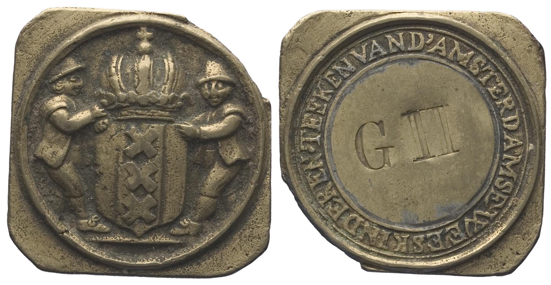 voorzijde: het gekroonde wapen van Amsterdam geflankeerd door twee weesjongens. keerzijde: binnen een omschrift een gegraveerd opschrift.- Trefwoorden