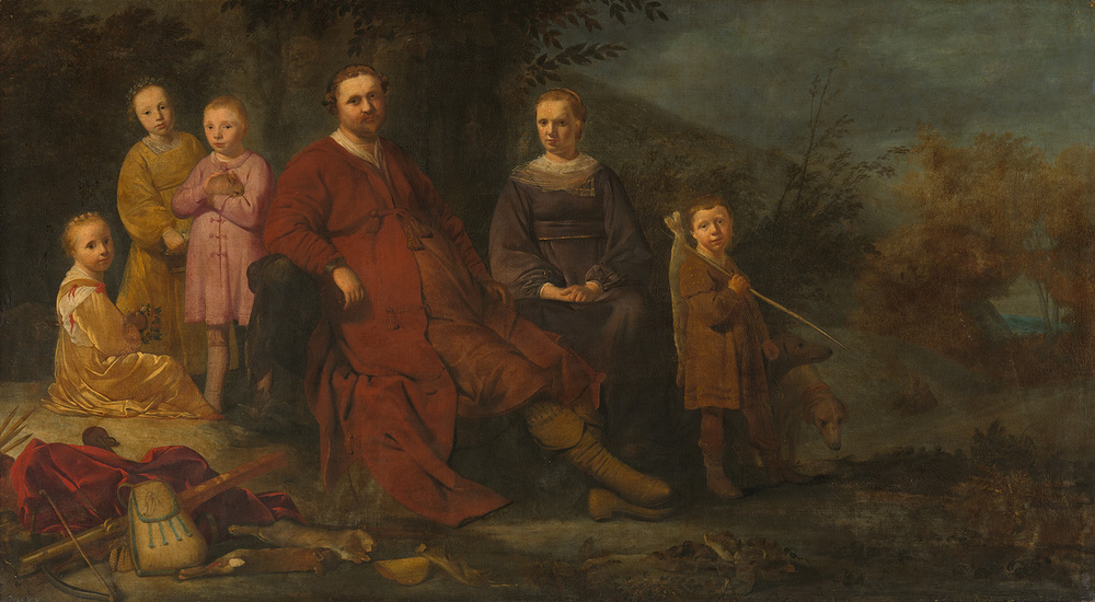 Zittende man in lage leunstoel, de benen languit gestrekt; naast hem een rechtopzittende vrouw. Links een groepje van drie kinderen, benevens enig jachtgerei; rechts een jongetje met een haas aan een stok over schouder. In een landschap achter de groep geboomte.