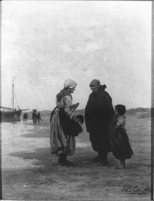 Een strandtafereel, met op de voorgrond twee vrouwen in streekdracht. Links in de achtergrond een gedeelte van een bomschuit en enige figuren.- Trefwoorden