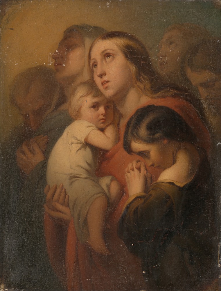 Een jonge vrouw met een kindje op de arm vormt het middelpunt van een groepje naar links gewende figuren met gevouwen handen en devote gezichtsuitdrukkingen. In de trant der nazareners.- Trefwoorden