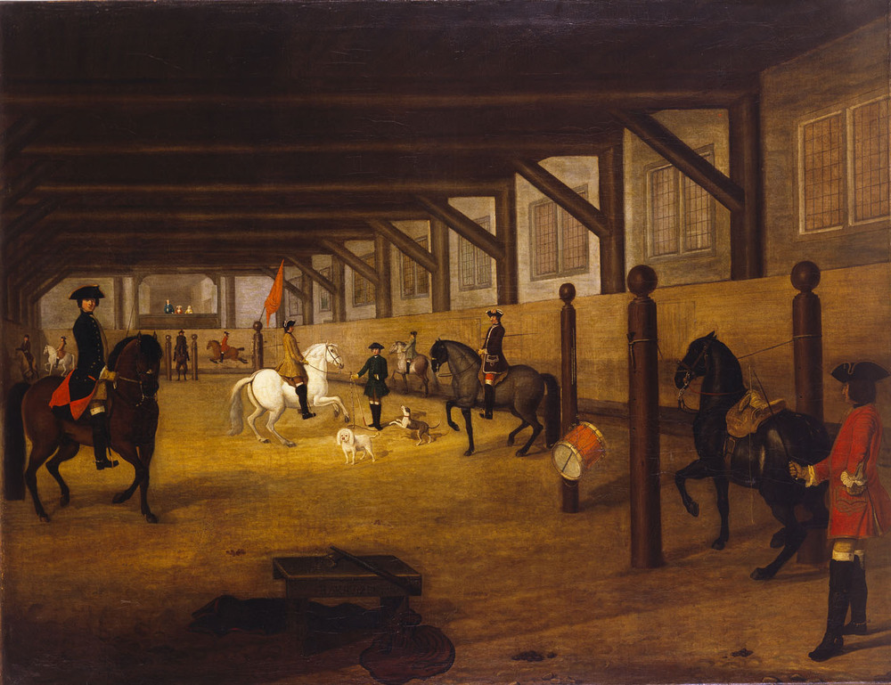 De oudste rijschool te Amsterdam lag aan het eerste Bolwerk ten Westen van de Blauwbrug. In het jaar 1726 bestond er een in de Amstelstraat bij de Botermarkt, later een in de Utrechtse dwarsstraat bij de Reguliersgracht (later als schouwburg ingericht). In 1744 werd op de Schans, aan het eind van de Leidsegracht, de "Hollandse rijschool" gebouwd. Deze was groot, had een loge voor toeschouwers, net als de manage op ons schilderij. In 1761 (nadat ons stuk ontstond) werd op het Weesperveld de "Franse Rijschool" gebouwd, waarbij de "Hollandse rijschool" als voorbeeld werd genomen (naar: C. van der Vijver, Geschiedkundige beschrijving der stad Amsterdam III, Amsterdam 1846, blz. 1-2).