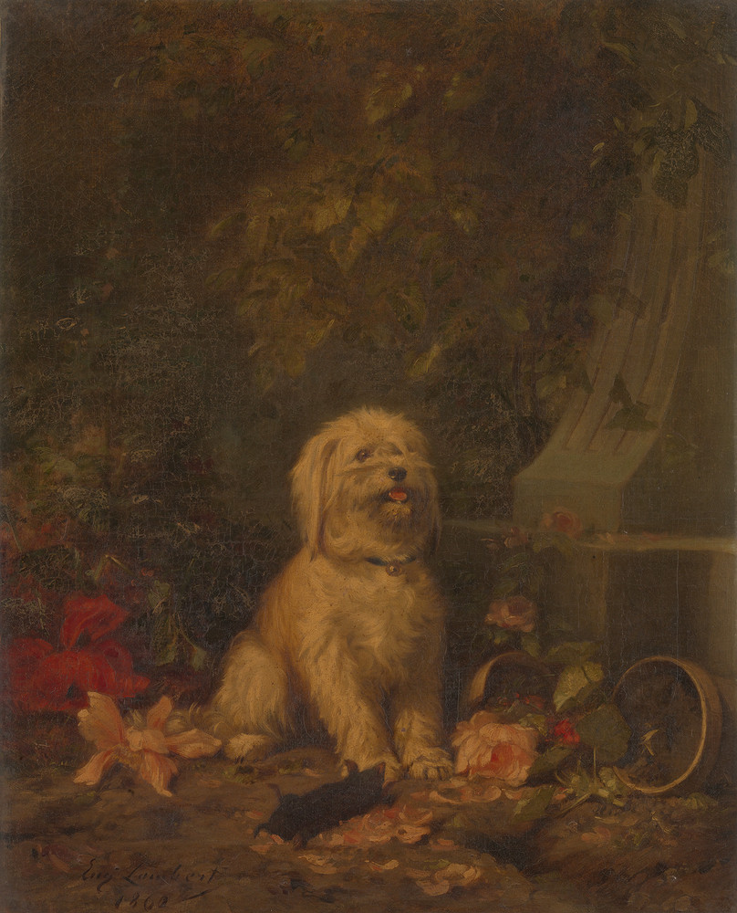 Op de voorgrond een wit, ruigharig hondje, zittend bij een dode mol in een tuin. Op de grond liggen enige geknakte planten, rechts voetstuk van een zuil. Romantisch tafereel.- Trefwoorden