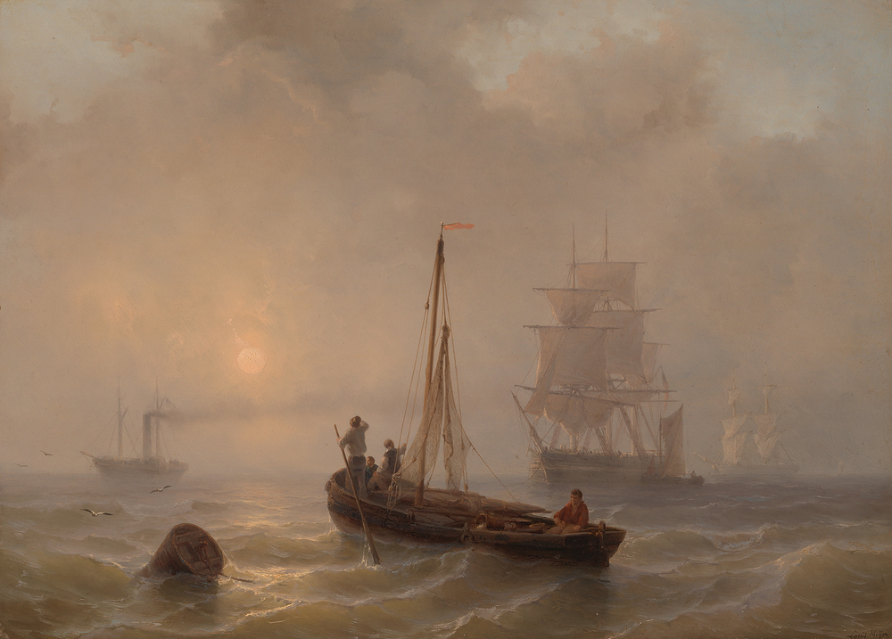 Gedeelte van een woelige zee met op de voorgrond een bemande vissersboot met gestreken zeil, en links een verankerd baken. Op de achtergrond rechts een tweetal driemasters met volle zeilen en links een stoomboot. Lage horizon met hoge bewolkte lucht, waar de laagstaande zon flauw doorbreekt.- Trefwoorden