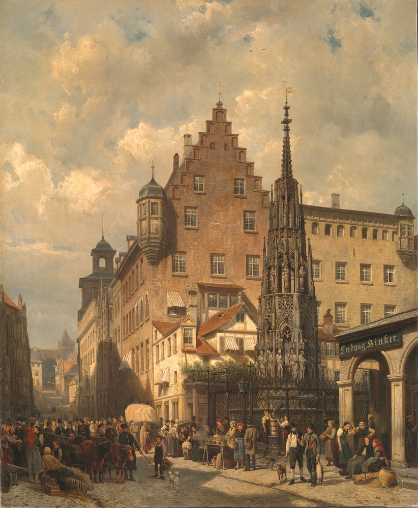 Druk bevolkte straat aan het begin waarvan rechts een hoog hoekhuis met trapgevel, waarvoor een hoog gotisch torentje op bron. Talrijke figuren bevolken het tafereel. Links in de schaduw een groep mensen, van wie de voorste enkele koeien leidt.