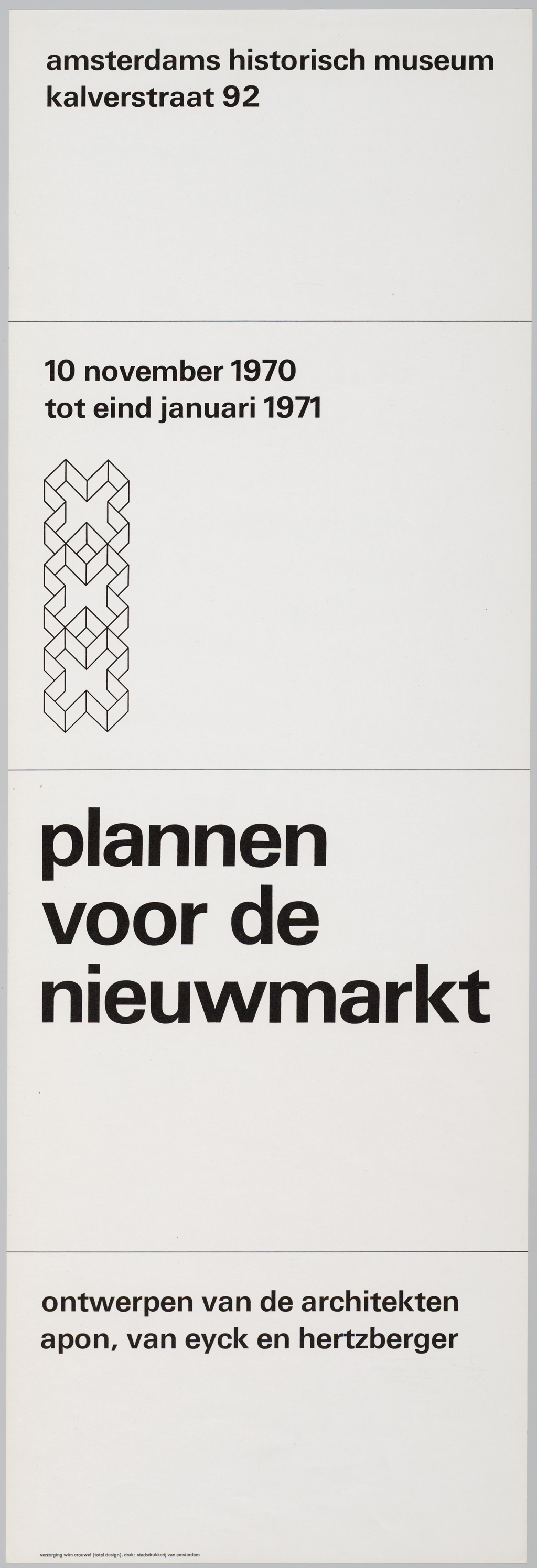 - 1970 - 1971, affiche voor tentoonstelling Plannen voor de Nieuwmarkt, ontwerpen van de architekten Apon, Van Eyck, en Hertzberger, 1970