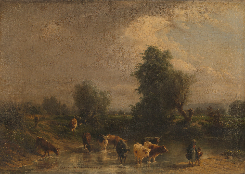 Landschap met verspreide bomen en een plas. Door de plas waadt een kleine kudde koeien. Vooraan op de kant lopen een meisje en een jongen. Aan de horizon zijn de blauwe omtrekken van bergen zichtbaar. Grijs bewolkte lucht met rechts een gedeelte blauw.- Trefwoorden