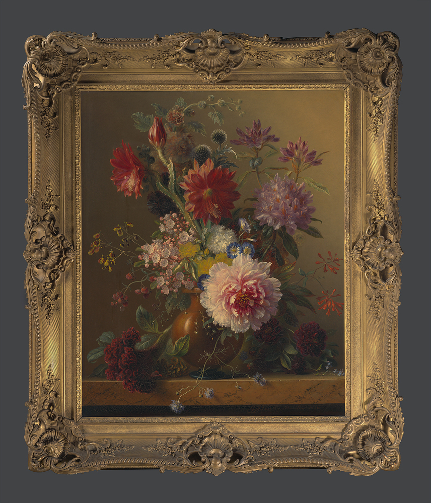 Georgius J. J. van Os leerde schilderen van zijn vader Jan van Os (1744-1808). Hij verbleef lange tijd in Parijs en werkte daar onder meer voor de porseleinfabriek te Sèvres. Aanvankelijk schilderde, lithografeerde en aquarelleerde hij landschappen; later vooral bloemen- en vruchtenstillevens. Bijna ieder bloemstuk heeft een of meer soorten die weinig of niet afgebeeld worden op andere schilderijen. Van Os werkte dan ook met veel verschillende bloemsoorten en ook wel met decoratieve vruchten als paprika en peper. Vaak zijn enkele soorten slechts vaag op de achtergrond te zien, ter versterking van de compositie. In dit schilderij zijn te herkennen, in een bruine aardewerk vaas met blauwe voet: Vlas, breedbladige lepelboom, pantoffelbloem, hertshooi, stokroos (paars), zuilcactus (rood), kogeldistel, rhododendron (paars), sneeuwbal, kamperfoelie, dagschone, pioen (rose), dahlia (roodbruin) en scabiosa. Op de stenen plint: Vergeet-mij-nietje en hanekam. ( Bert Vreeken)
