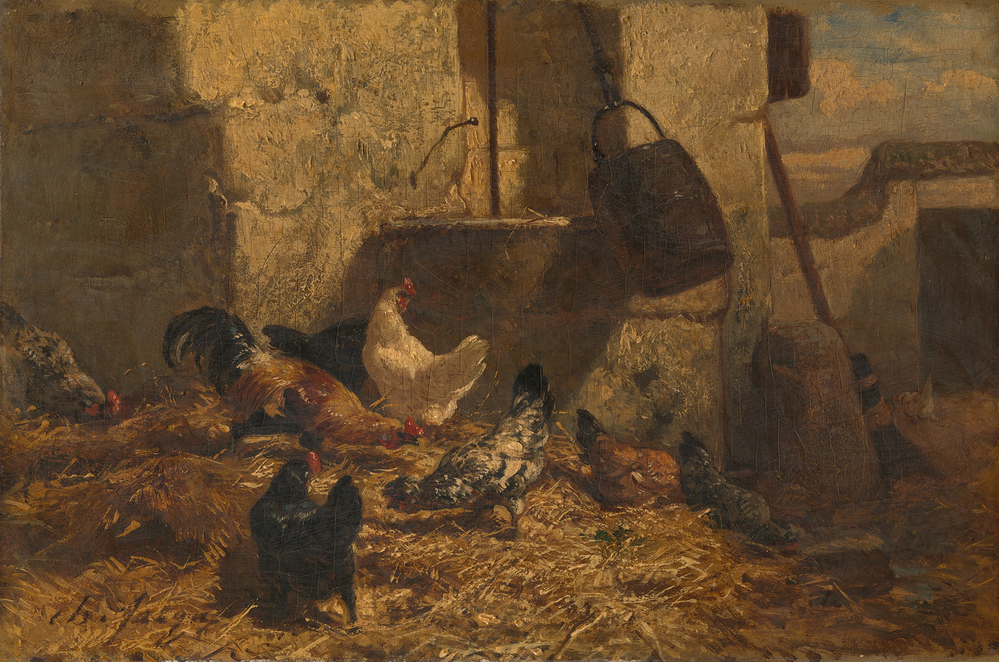 Bij een waterput, opzij van een huis, een aantal kippen, pikkend tussen het stro. Rechts, boven poortmuur, is een stuk lucht zichtbaar. Fel zonlicht op gedeelte van de muur bij de put en op enkele kippen.- Trefwoorden