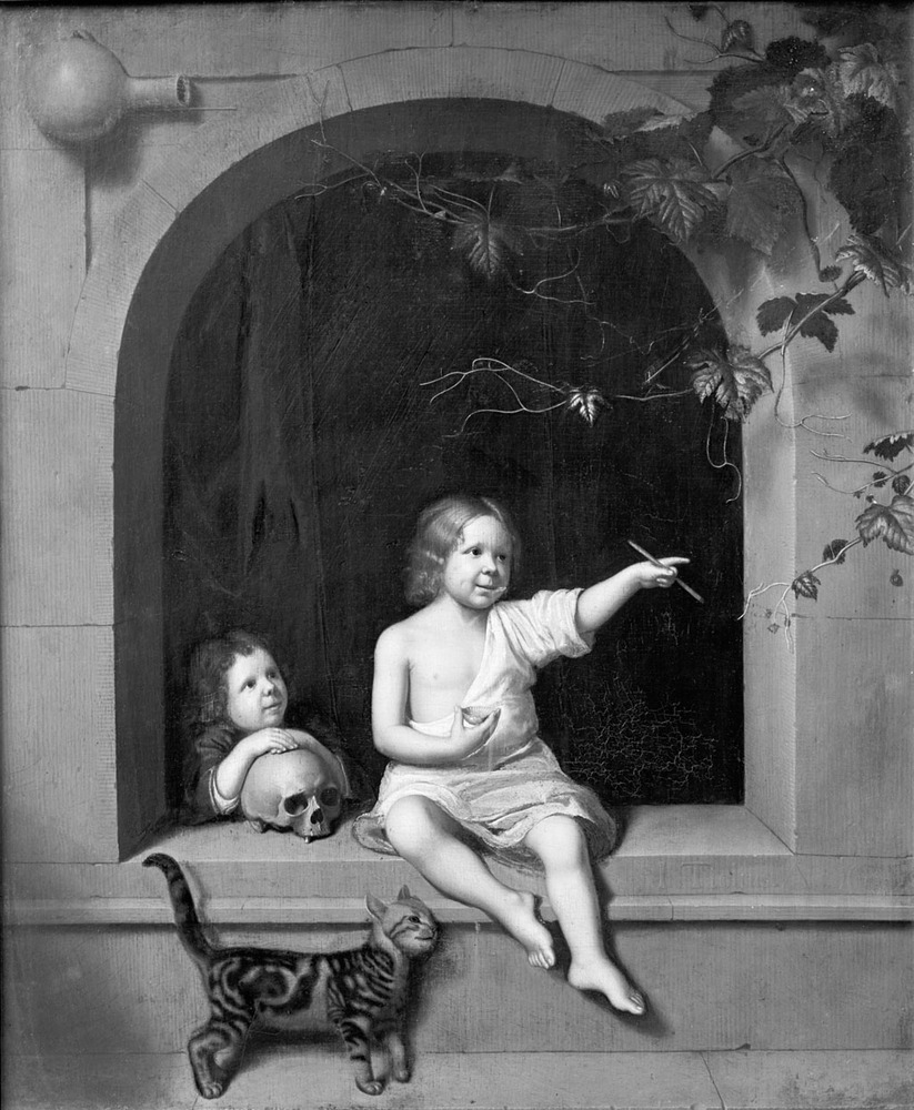 In boogvormig stenen kozijn, een jongetje, slechts gekleed in een hemd, dat met zijn linkerhand een wijzend gebaar maakt. Binnenstaand een kleinere jongen die met beide handen op een doodskop leunt. Voor het kozijn een gestreepte kat.