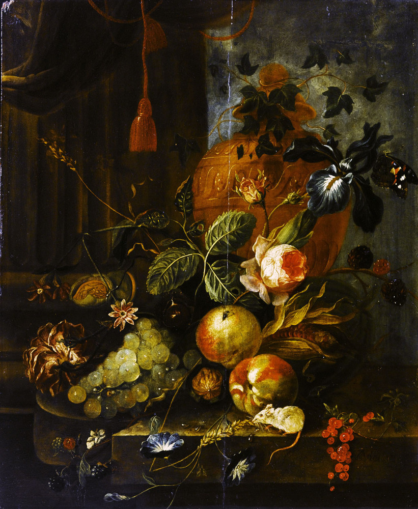 legaat 1890-03-04 inv.nr. SA 503 in depot Een verzameling planten, bloemen en vruchten bij elkaar gerangschikt op een stenen blad, waarop ook een witte muis. Donkere vlakke schildering.