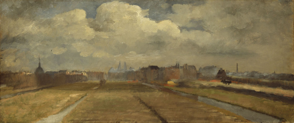 Na 1880 begon Amsterdam gestaag te groeien. Voor het eerst werd er op grote schaal buiten de oude Singelgracht gebouwd. Dit vergezicht vanaf een punt tussen het Vondelpark en de nog onbebouwde Willemsparkweg toont de nieuwbouw aan de zuidrand van de stad. Links de Koepelkerk aan het Leidseplein (1884, gesloopt 1972), in het midden het Rijksmuseum (1885) en rechts op de achtergrond het Concertgebouw (1888). De hoge schoorsteen markeert de Waskaarsenfabriek aan de Boerenwetering. Het schilderij zal zijn vervaardigd vóór de bouw van het Stedelijk Museum in 1894. Marie Heineken leerde onder meer aan de Rijks-academie bij August Allebé. Zij woonde en werkte haar gehele leven in Amsterdam.