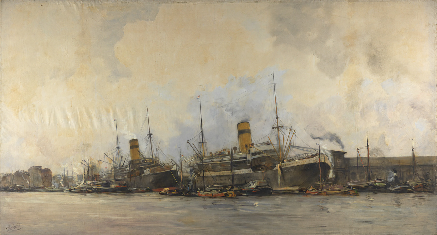 Hobbe Smith heeft twee schepen van de Lloyd aan de Panamakade, aan de zuidzijde van Sporenburg, in beeld gebracht, waaronder vrachtpassagiersschip Hollandia, dat in 1909 van stapel liep. De vele afgebeelde hijskranen en de omringende kleinere schepen tonen de grote bedrijvigheid in dit deel van de haven.