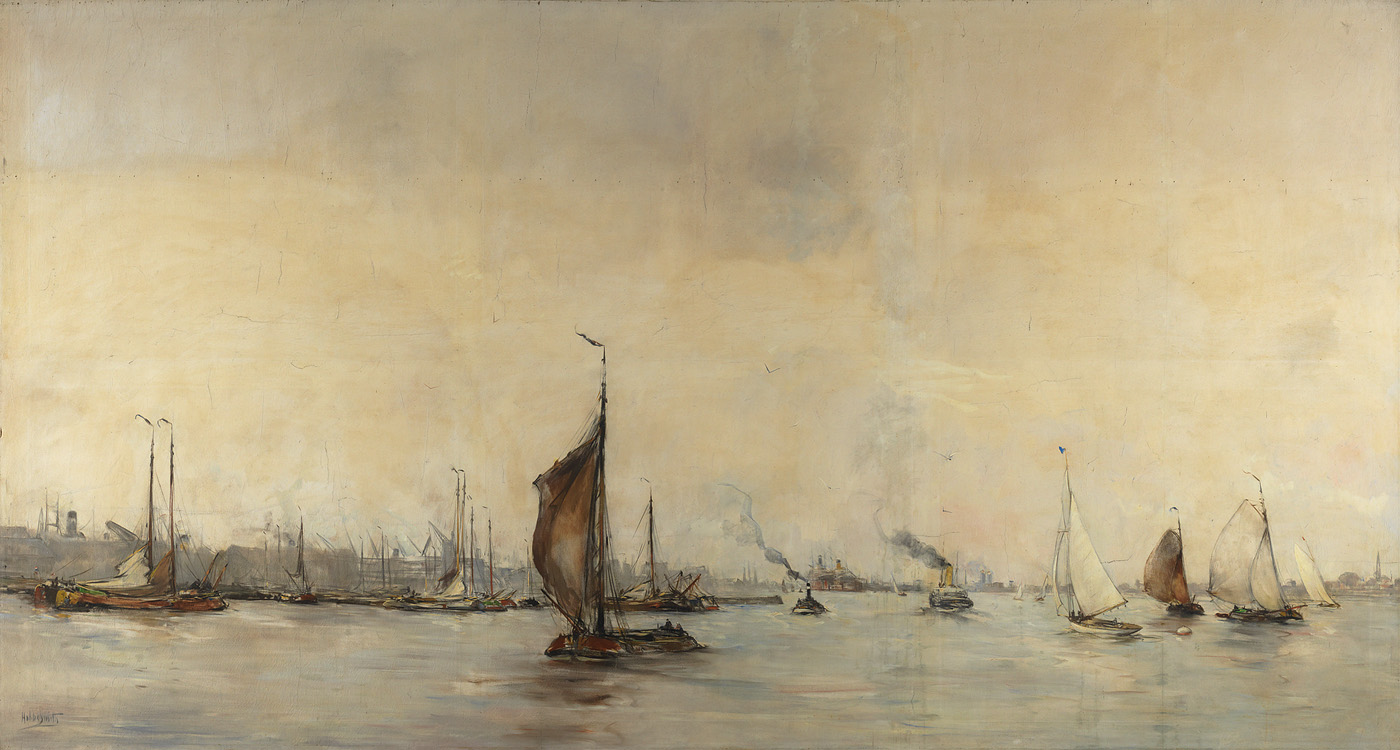 De schilder heeft links de aanlegplaatsen met de kleinere zeilschepen weergegeven. Zeilschepen en stoomboten bevaren het IJ en in de verte liggen grote stoomschepen aangemeerd in het oostelijke havengebied. Op de achtergrond het stadsprofiel van Amsterdam, waarin met enige moeite de torens van de Posthoornkerk zijn te herkennen, links van het Wilhelminadok. ( Daphne Willemsen)
